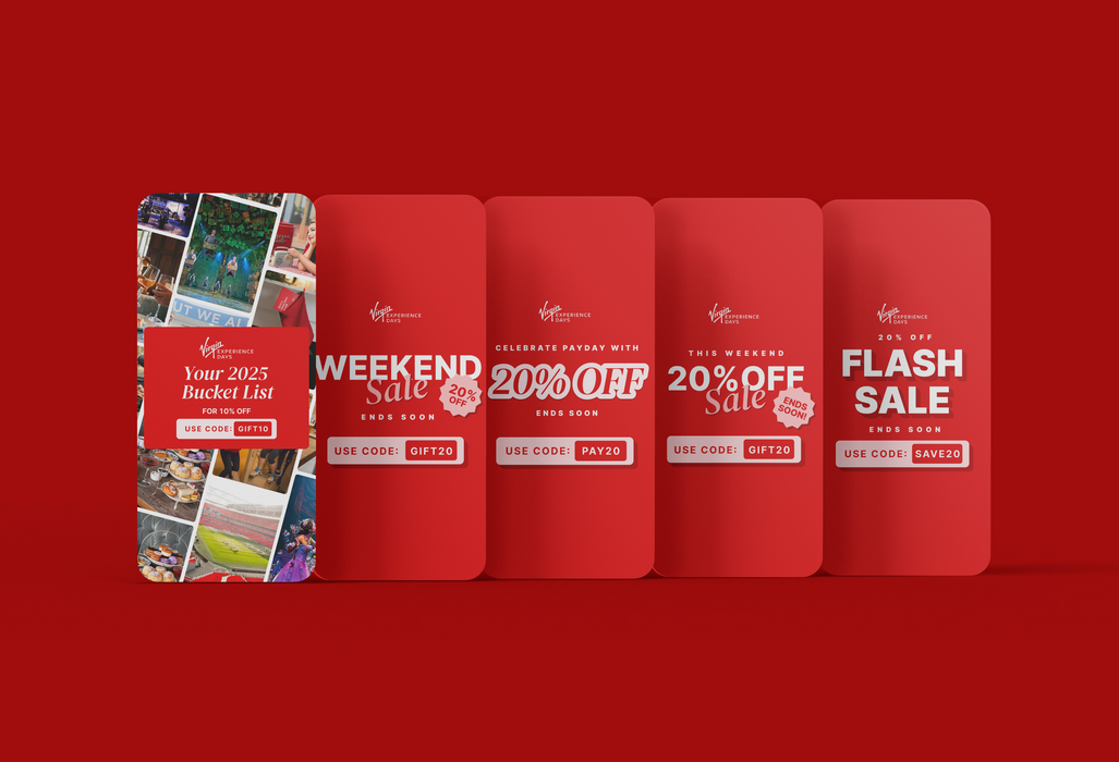 During my time at Virgin Experience Days I was tasked to redesign their short term sales creative as their previous sales promotions showed brand inconsistency.